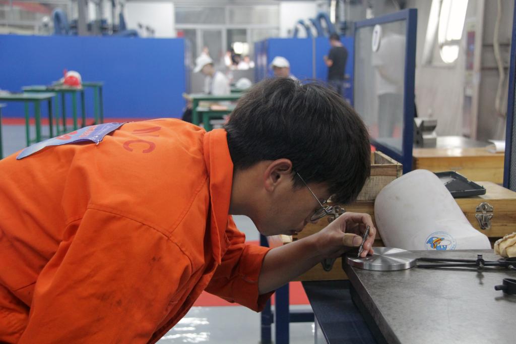 作为经典的轮机员技能展示项目,金工工艺要求选手们利用车、钳、焊工艺,在150分钟内加工一块带孔盲板和一只带管子的法兰,要求安全操作、符合规范,工艺良好,分工协作并动作迅速。各个院校队选派5名轮机专业学生,分别完成气割、车工、焊接、钳工和装配。下午,我校选手顺利完成该赛项,最终成绩须待明天另外8支院校队比赛结束后揭晓。