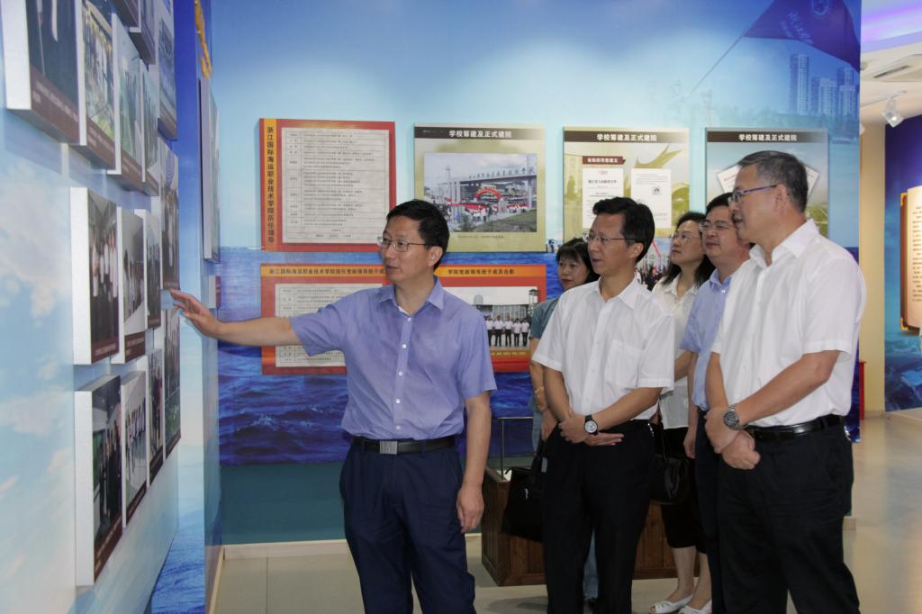 王利月副部长一行先后来到我校行政楼、校史馆、国际海员培训楼、综合实训楼等参观,详细了解了学校人才培养及专业建设工作,对学校贴近地方办学、努力服务海洋经济的做法表示赞赏,对舟山开展并做好职业教育工作方面取得的成绩表示肯定。