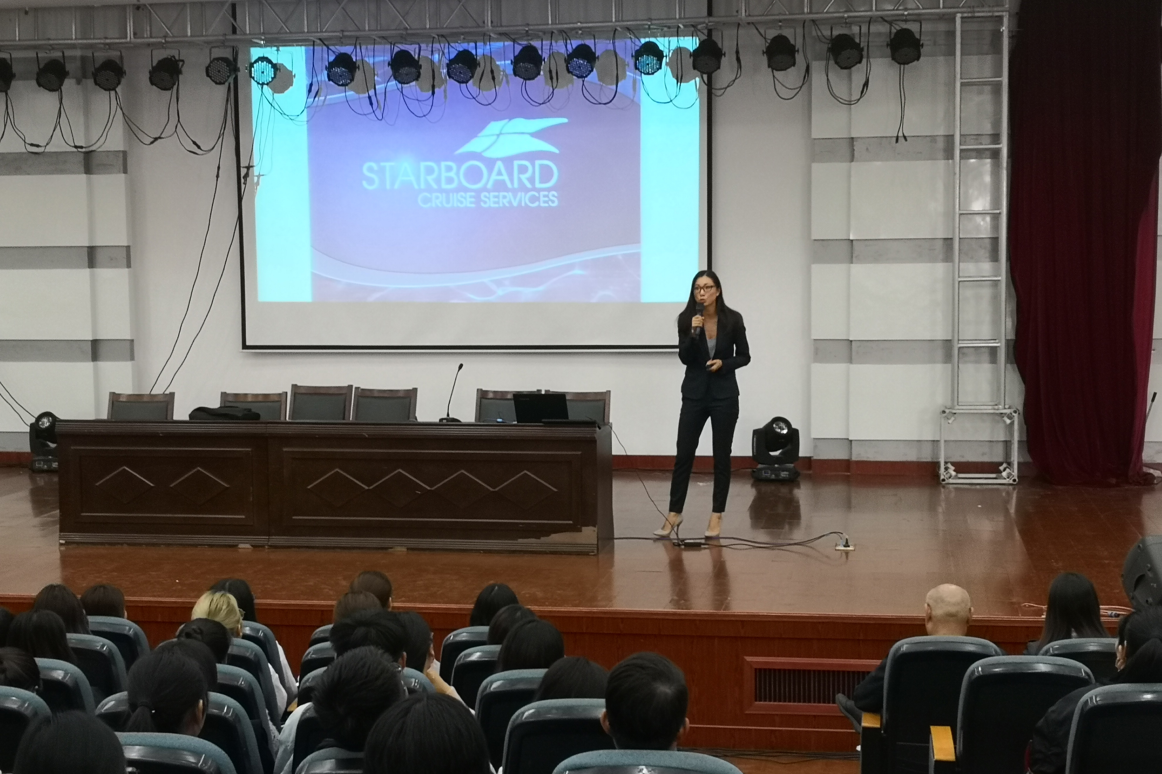 当天晚上,第一次企业培训课正式开课。企业代表以及邮轮培训师给订单班学生讲解了企业文化、邮轮品牌文化、邮轮行业的发展前景等,并对学生提出了一些要求。