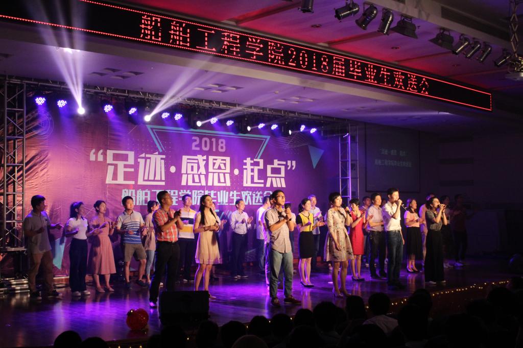 晚会在船舶工程学院全体教职工的表演《相亲相爱一家人》中拉开帷幕:第一篇章“足迹”由回顾校园生活的舞蹈、经典咏流传、情景剧、杯子舞等节目组成;第二篇章“感恩”用话剧社、动漫社、摄影社、精武社的精彩节目讲述了同学们在学院“同舟基金”感恩校园文化品牌引领下,在校内外各类活动中学会了感恩;第三篇章“(新的)起点”结合了充满希望的手语表演《追光者》、激情澎湃的朗诵《三年前》、语重心长的院长寄语等环节,回顾了大学的青春足迹,指明了未来的前进方向,表达了母校老师对毕业生的期望。晚会在各位老师和毕业生代表合唱的《毕业歌》中圆满落幕。