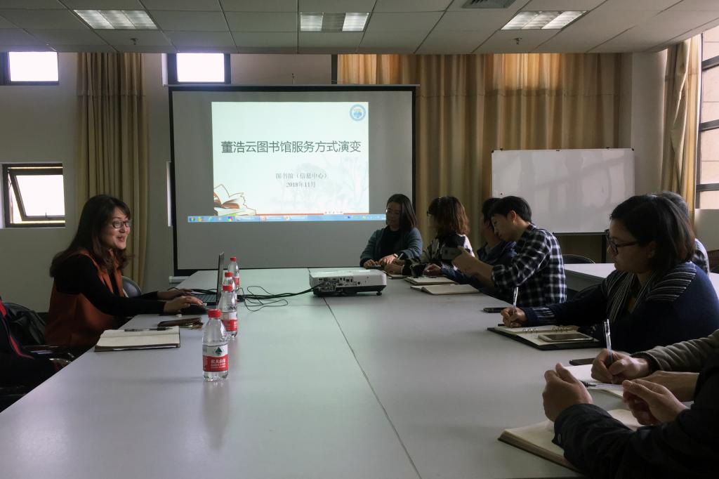 周勤副馆长图书馆同仁举办了一场《董浩云图书馆服务方式演变》的交流讲座,分享了以学科馆员为代表的服务方式的演变及助推校园文化建设的若干途径。会上,大家就图书馆文献资源建设、参考咨询、采编流通等业务进行了广泛的研讨,气氛和谐热烈。