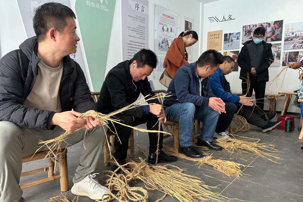 党员们首先参观了渔民广场,回顾蚂蚁岛历史沿革与人文社情。在党旗之下,全体党员重温入党誓词,在庄严宣誓中明澈本心、牢记使命;随后,在参观马金星《军港之夜》词作地时,全体党员情不自禁合唱《军港之夜》,感受着身为航海人的情怀与自豪;在织渔网、搓草绳体验中,党员们通过行动感受着蚂蚁岛人民的艰苦创业过程,共同完成一堂意义深刻的“劳动教育”。此外,大家还一同参观了人民公社旧址、村史陈列室,观看了蚂蚁岛纪录片,并认真聆听老党员林妙珠讲述艰苦创业的感人故事。林妙珠同志作为新中国第一批女轮机长,她的亲身经历对航海类专业的教育教学起到了示范引领作用,也成为航海类专业教育中最好的课程思政内容。林妙珠同志讲述过后,在场党员们深受触动,争相上前合影留念,轮机支部党员更是与有荣焉,表示要将老同志的亲身经历转达给轮机专业的学生们,以榜样力量促学习、共奋斗。