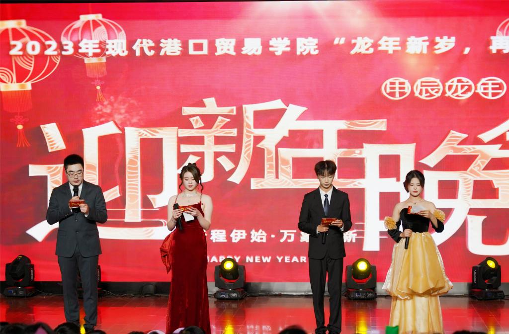 12月28日晚,现代港口贸易学院2024“龙年新岁,再奏华章”迎新年文艺晚会在董浩云图书馆四楼报告厅成功举办。校党委委员、副校长夏志刚,现代港口贸易学院院长王贵斌、副院长柏昌顺、党总支副书记傅红波以及各专业师生450余人观看了演出。