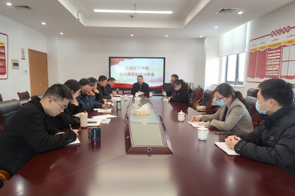 1月5日上午,石油化工学院党支部在508会议室召开了2023年度支部党风廉政建设分析会。校党委委员、副校长夏志刚,校党风廉政建设工作考核组成员苏峰、王海玲出席会议,学院班子成员参加会议,会议由学院党支部书记张海波主持。
