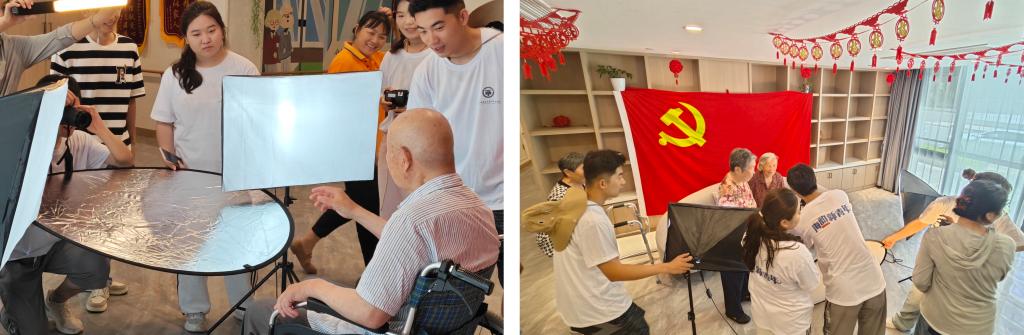 在普陀创生会养老院,实践成员们用镜头给百岁老人们拍下了一幅幅“党旗的合影”,他们耐心倾听老人们讲述过去的故事,用照片记录下他们的笑容和回忆,用留影表达了对党的忠诚和敬意。