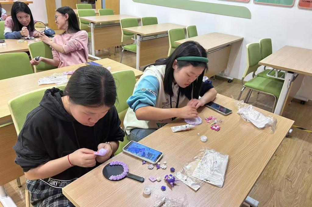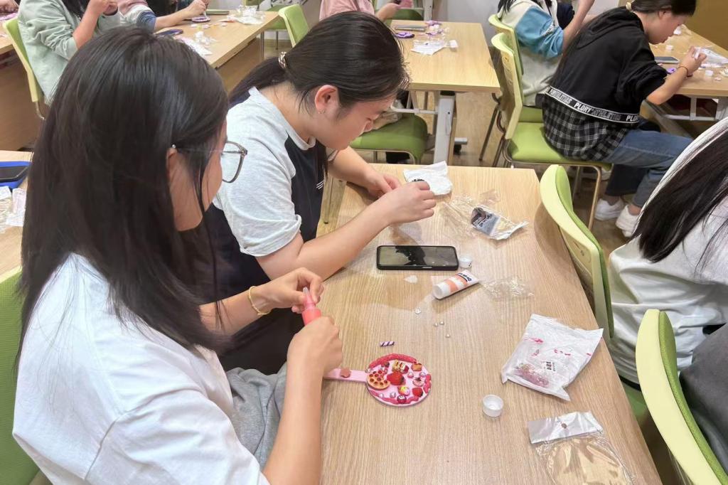 学生志愿者们在教室里两两组合,围绕活动主题,借助奶油胶、小饰品等材料,尽情挥洒自身想象力,在镜子上精心设计出了极具创意的搭配,展现出了学子的活力与创造力,为社区活动增添了别样精彩。
