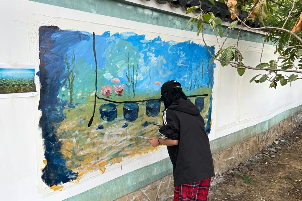 同学们通过构型、上色、细节处理,字体喷绘,围绕虾、蟹、渔船、捕捞作业等海洋特色元素和场景,运用所学专业技能进行创意设计和喷绘,让原本空白的墙壁充满“海味”,实现了“一墙一风景”“一墙一文化”。