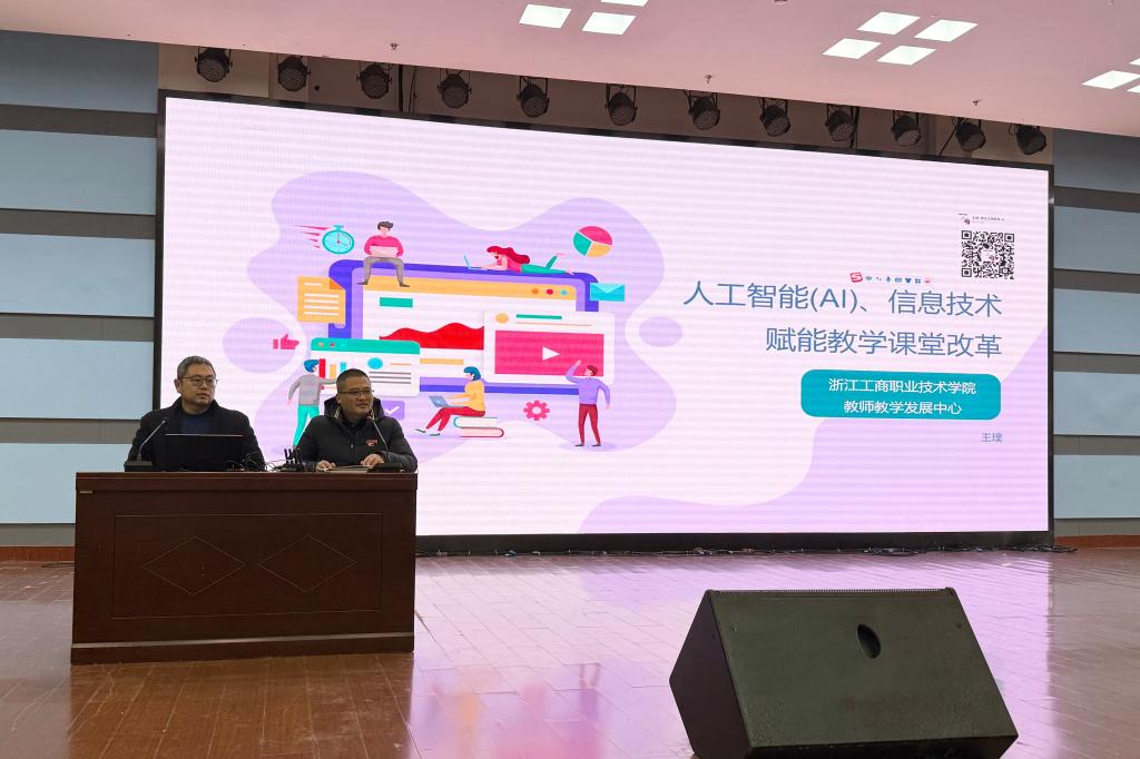 本次教师培训第一课由浙江工商职业技术学院王璞老师作《AI赋能课堂教学创新》专题讲座。讲座紧紧围绕如何运用AI大模型提升教师教学能力这一关键问题,从AI制作PPT、AI助力文档写作、AI制作图片、AI虚拟仿真、AI数据分析等方面对国内主流的AI大模型进行了全面深入的解读。在讲座过程中,王璞老师时不时穿插一些与广大教师密切相关的案例,如AI美化PPT技术、AI撰写教案技术、智能体及教学辅助开发技术等,诙谐幽默的案例赢得了在场广大教师热烈的掌声。讲座末尾,王璞老师还慷慨地分享了自己积累许久的AI大模型网址,为提升广大教师的AI应用水平提供了强大助力。