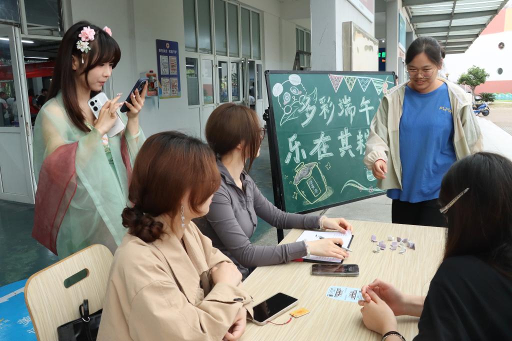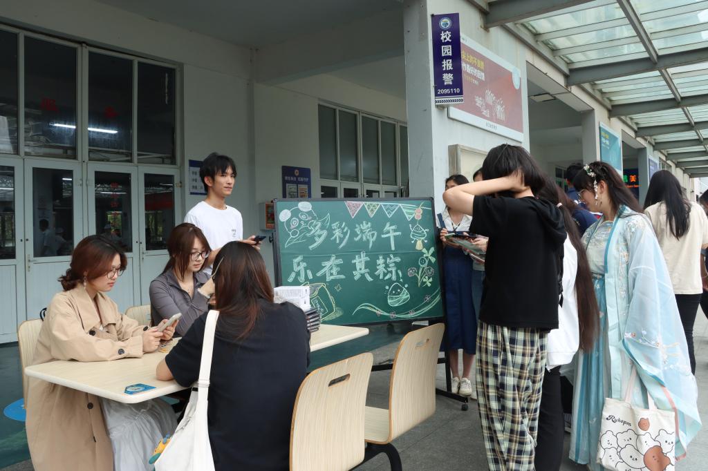 学生食堂外是由校权益部承办的“五彩端午”端午节知识问答活动。问答题目涵盖了端午节的起源、发展历程、传统习俗等内容。身着汉服的国粹社社员前来助阵,为过往的活动参与者普及端午节地方习俗和节日禁忌。