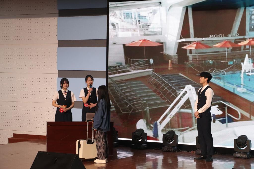 大赛设礼仪操、情景模拟、个人才艺展示三个环节。礼仪操尽显专业风范;情景模拟围绕导游、邮轮、酒店、食品检测、侍酒等服务场景,选手们从容应对;才艺展示环节,走秀、朗诵、歌唱等表演精彩纷呈,选手们各展所长。
