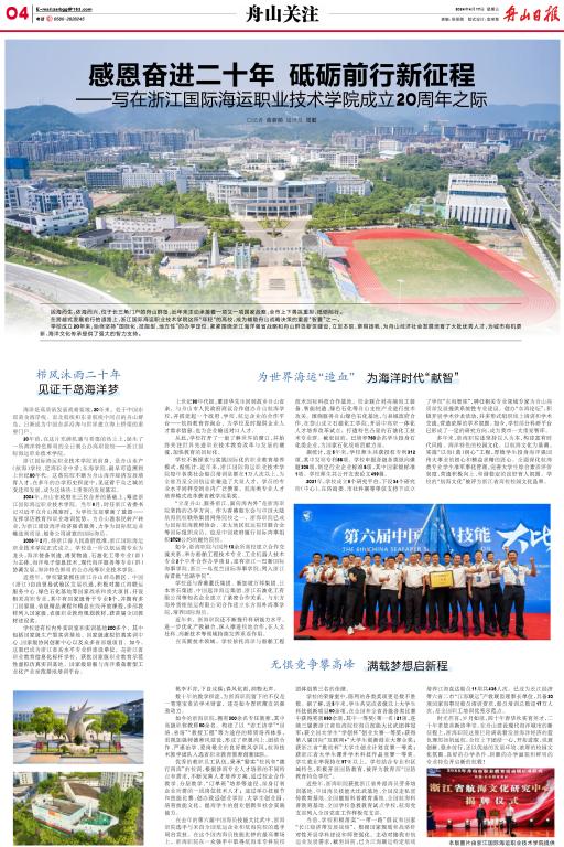 学校成立20年来,始终坚持“国际化、技能型、地方性”的办学定位,紧紧围绕浙江海洋强省战略和舟山群岛新区建设,立足本职,奋楫扬帆,为舟山经济社会发展培育了大批优秀人才,为城市有机更新、海洋文化传承提供了强大的智力支持。