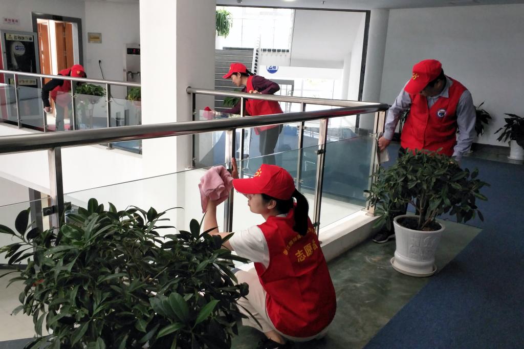 随后,党员志愿者们分工明确,按照各支部的责任区域,拿着抹布、报纸等工具,对行政楼内扶手、窗台、消防设施、及宣传栏窗等进行清洁整理。经过一下午的辛勤劳动,行政楼内窗明几净,环境更加整洁。