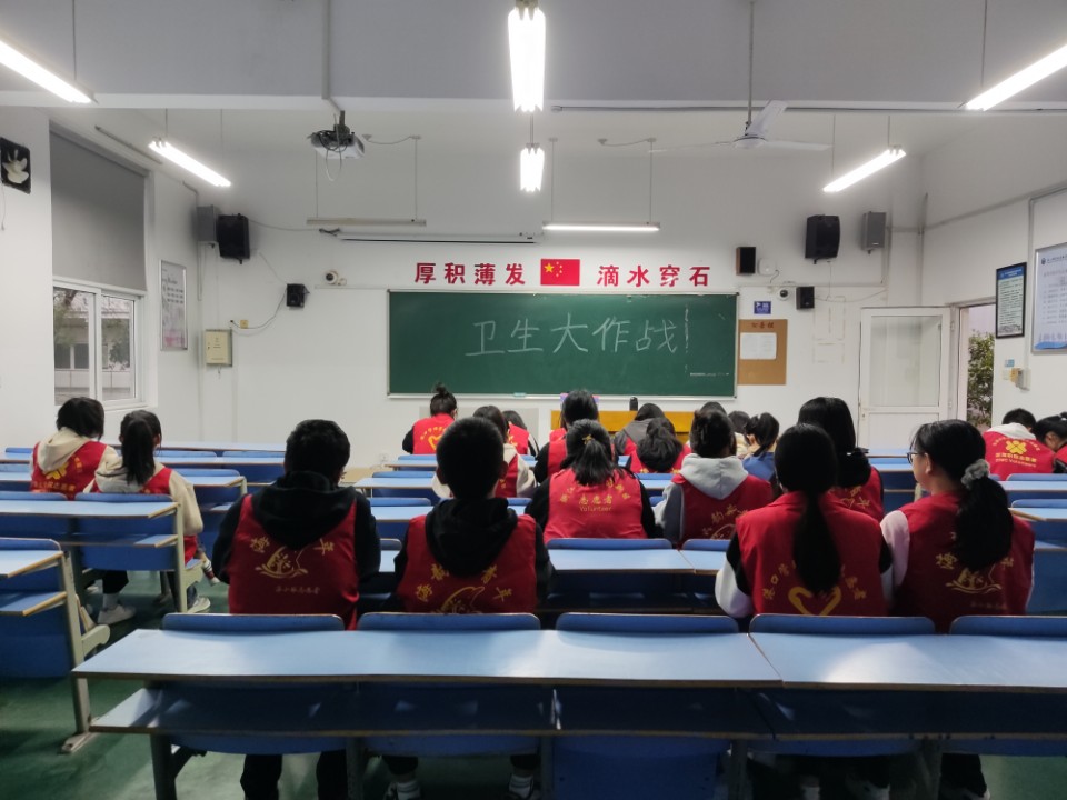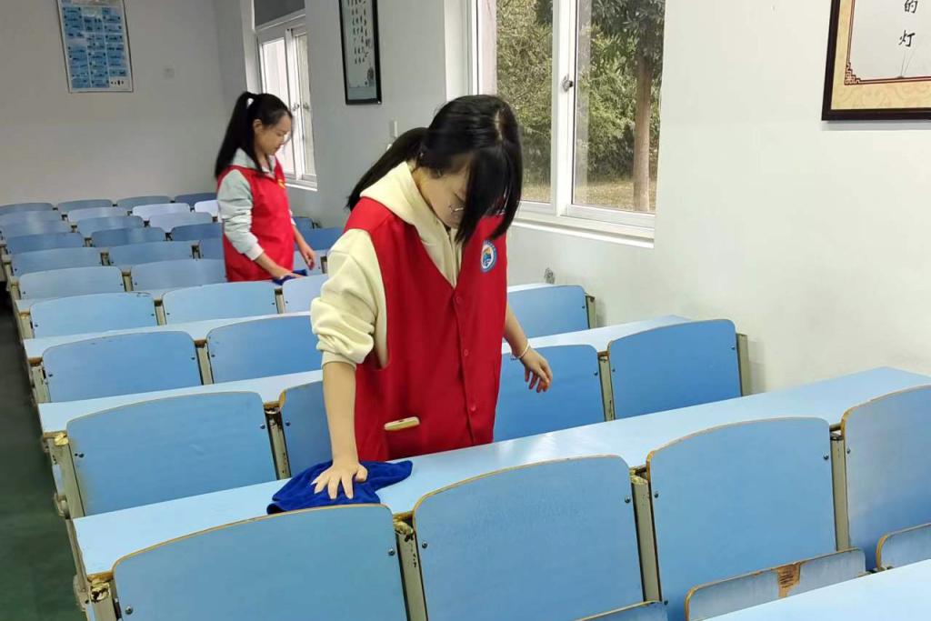 同学们组织有序,分工明确,干劲十足,拿起抹布、扫帚、拖把、刷子等工具,认真打扫地面,清理垃圾,擦洗桌椅、门窗、玻璃、墙壁等区域,不留死角。